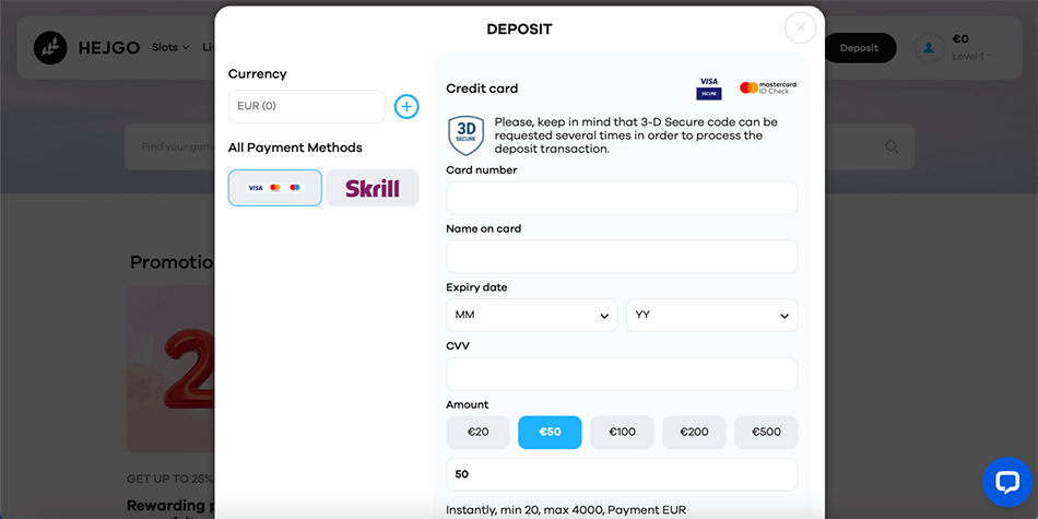 Depositing funds from your chosen payment method is instant. Whether you choose to do so using Visa, MasterCard, or EcoPayz, you can expect to have funds reflected immediately. Check out some of the most tried and trusted payment options at Hejgo Casino.