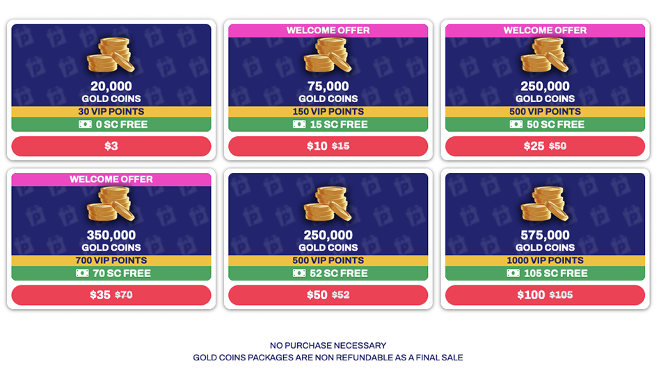 However, no purchase is necessary for Gold Coins since they are gifted to you daily. Importantly, there is no redemption value for GCs as pointed out earlier – they are in-game currency used to play games – not for gambling – simply for playing.