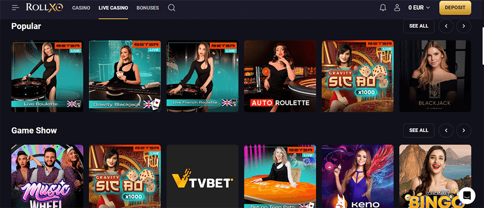 Table games, although not grouped or clearly shown, are a popular choice amongst casino gamers. By searching for your favourite table game or scanning through the live casino section, you be able to locate your desired table game. With games such as Blackjack and Roulette. These games are seen at most online casinos today and are timeless classics but some versions of these games have a unique modern twist which is always exciting to see. Other popular games in RollXO table games selection include Baccarat, Poker and Sic Bo.
