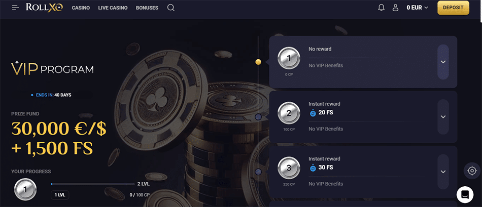 VIP/Loyalty Program – In order to become a VIP at RollXO Casino you will need to deposit at least €2500 or that equivalent. Once you have reached this deposit amount, you will gain access to the site’sVIP rewards system.