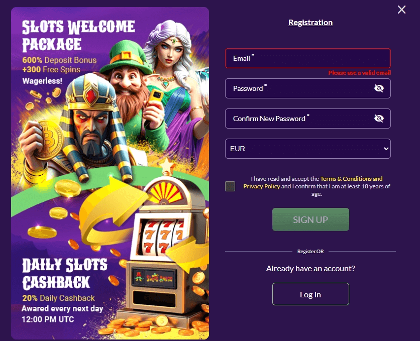 Step 1: Create an Account: Visit the Slots Amigo Casino website and click “Sign Up” to open the registration page. Fill in your email address, password, and preferred fiat currency (EUR or GBP). Read the platform’s Terms and Conditions page and Privacy Policy before registering. Check all the boxes and click “Sign Up” to create your account.