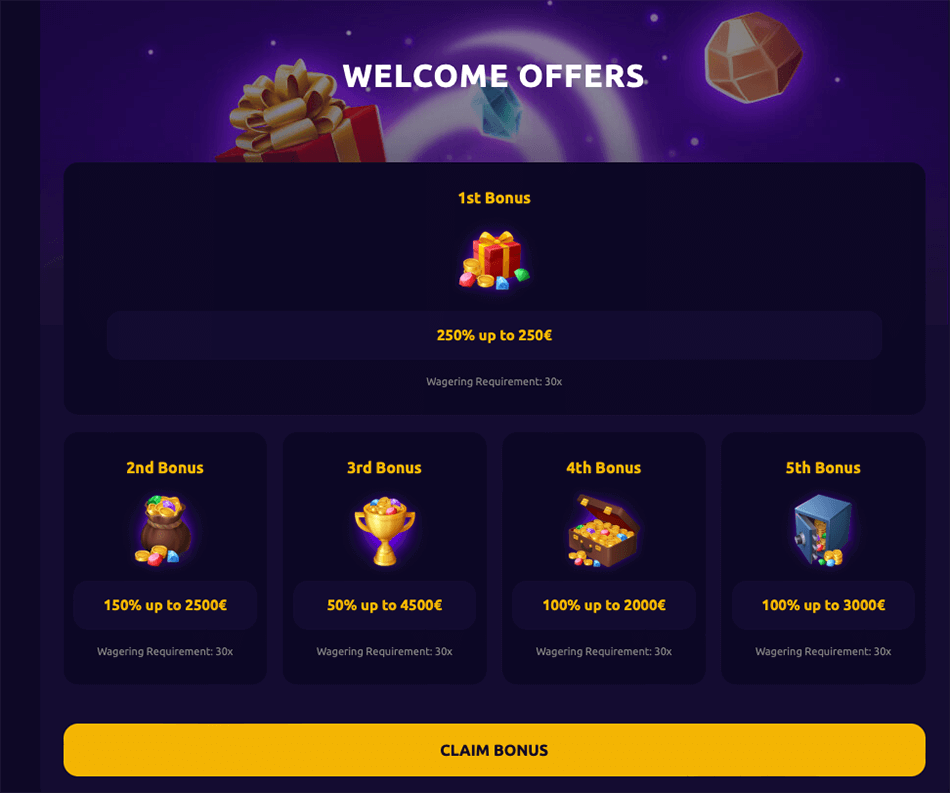 SpinTime Casino has one of the highest welcome bonuses our experts have encountered in a while of up to €12,250 across the player’s first 5 deposits. Additionally, loyal existing players can count on generous reload bonuses three times a week.