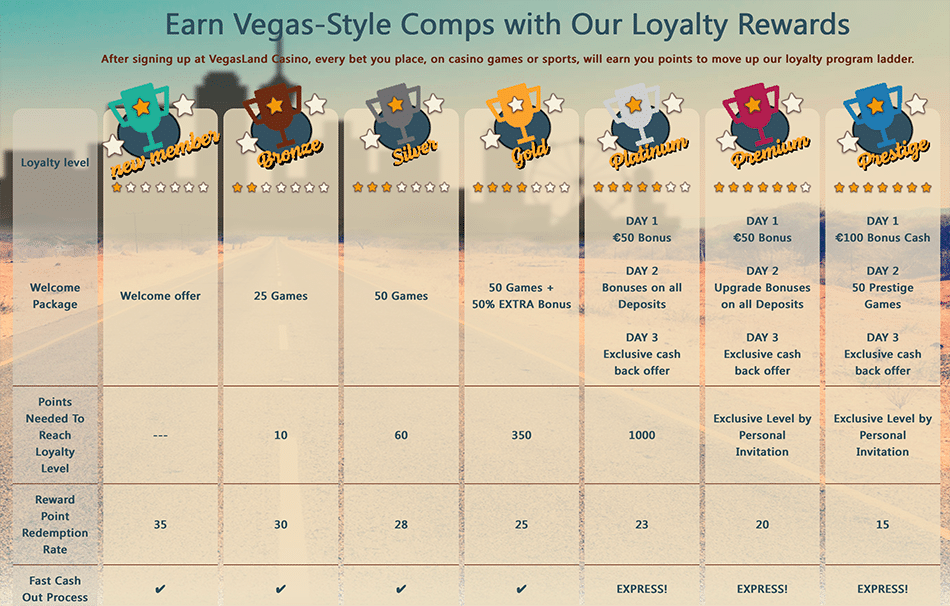Vegasland Casino Loyalty Program – The Vegasland VIP loyalty program is one of the most rewarding aspects of the entire site. As you place bets on both sports events and casino games, you will earn 1 Reward Point for every €40 wagered.