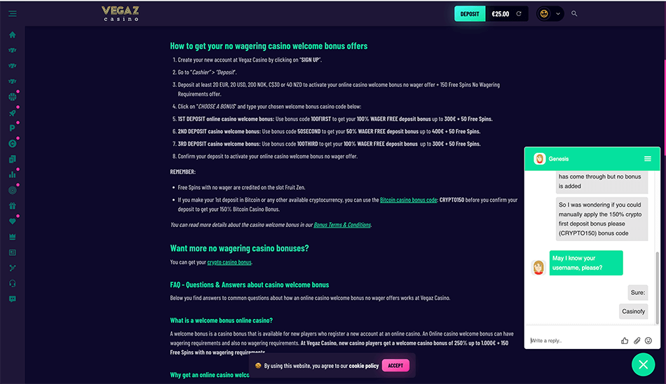 As Vegaz Casino is getting increasingly popular among players across the globe and we want our independent casino review to be as inclusive as possible, we decided to answer the most frequently asked questions about the site in the section below.