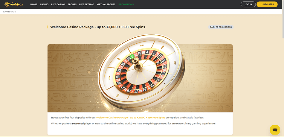 Win Mega offers a welcome package of up to €1,000 and 150 free spins on six different games over the first four deposits. I’ve broken it down below.